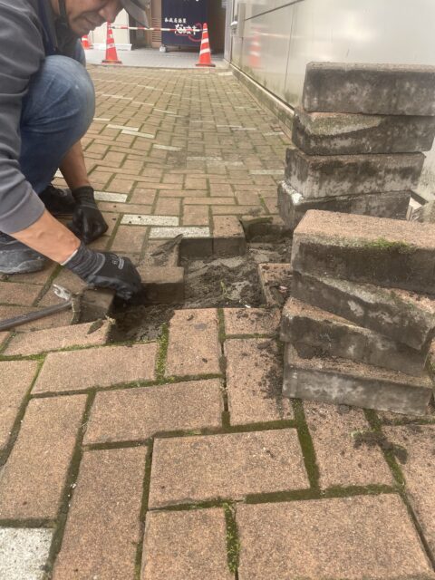 地盤沈下でガタガタになったインターロッキングの補修工事。