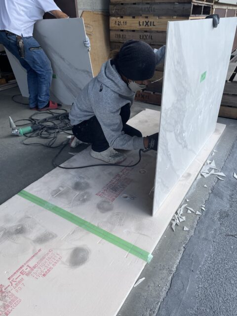 今日は、いつもお世話になっている会社さんの倉庫にて大判タイルの加工をしました。